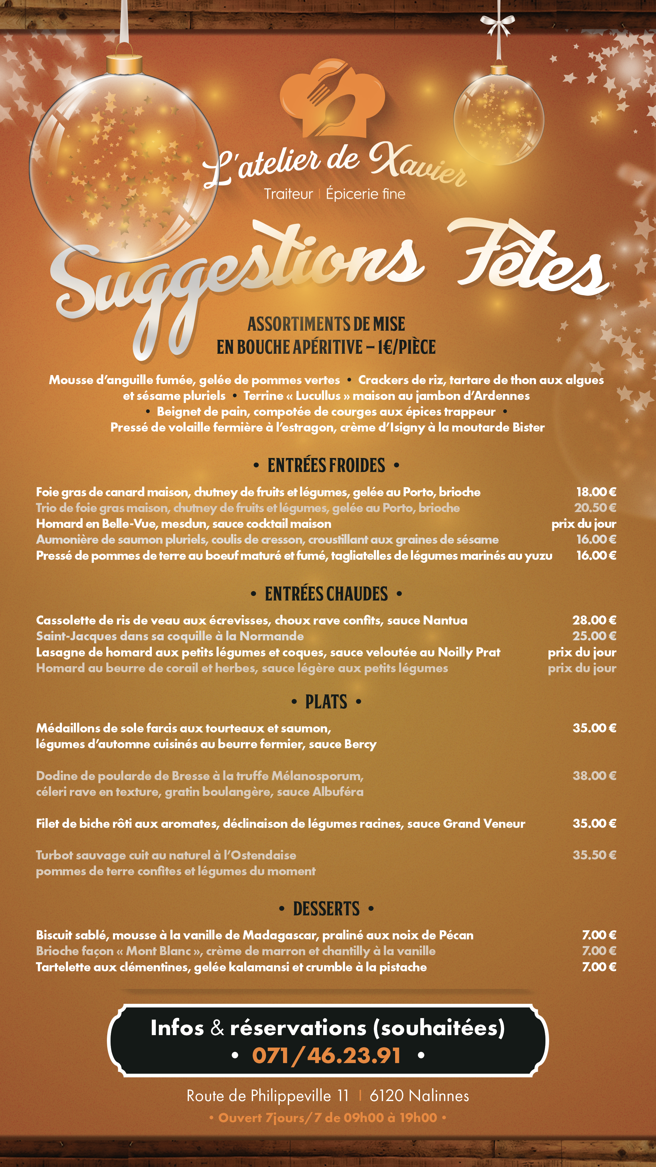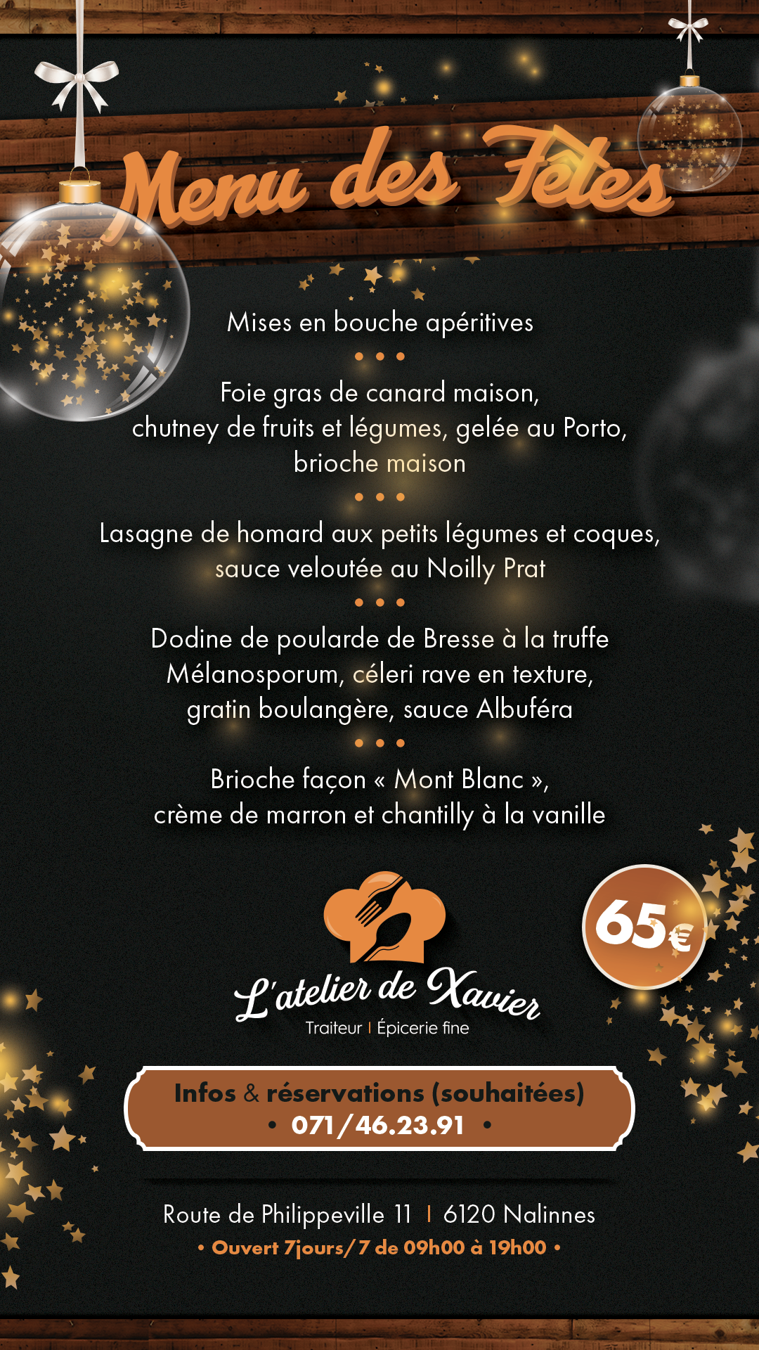 Bienvenue à L’Atelier de Xavier, votre épicerie fine & traiteur à Nalinnes Bultia. Nous vous proposons chaque jour des plats préparés maison, réalisés par notre Chef Dany Lombart et son équipe, ainsi qu’une sélection soignée de produits artisanaux : biscuits, miels, huiles, vinaigres, chocolats, nougats et bien d’autres découvertes gourmandes à savourer ou à offrir.